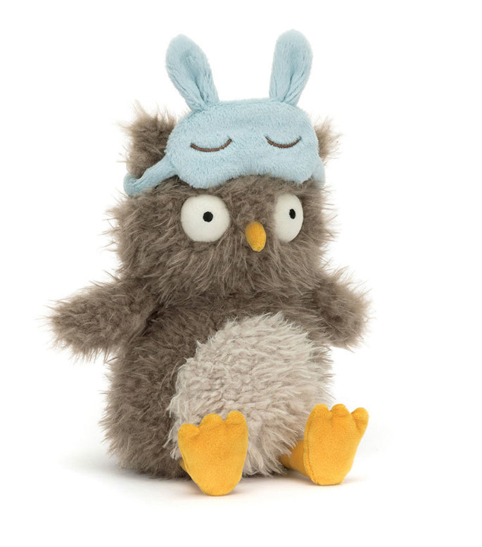 Audrey Hootsoftly loves to sleep in, which is why she's wearing her blue suedette mask! It's even got embroidered lashes! This mocha owl has bed-head fur and wide-awake bobble eyes! With sunny feet, tiny wings and a oatmeal patch on her tummy, Audrey's an absolute hoot.